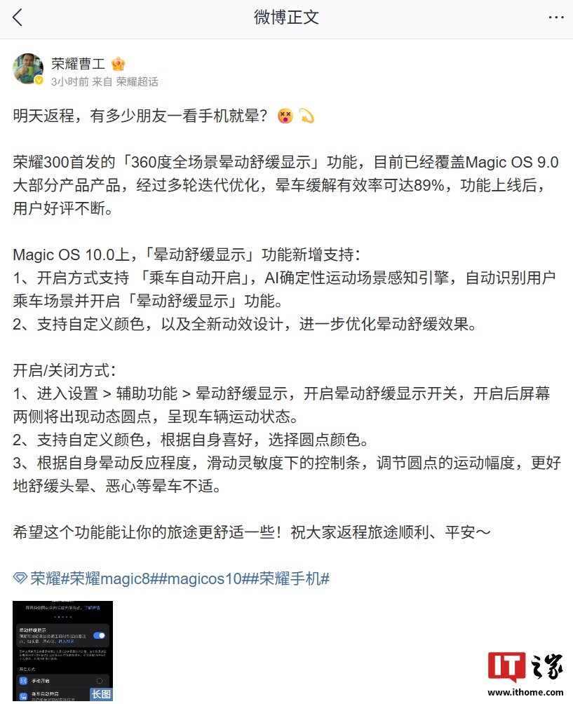 IT之家 10 月 7 日消息,荣耀 Magic 系列旗舰手机系统工程师 @荣耀曹工 今日在微博介绍了 MagicOS 10.0 系统的「晕动舒缓显示」功能。据称最好的配资官网,该功能将新增支持如下特性: