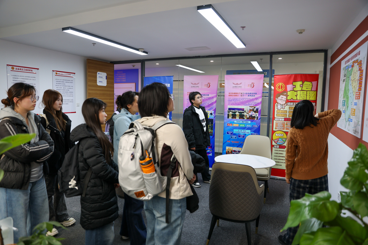 活动中,首经贸学子依次参观职工书屋、心理疏导区、母婴关爱室、劳动争议调解室等功能区域,近距离了解职工之家的阵地运营、日常服务、活动开展及企业职工使用情况。街道总工会工作人员详细介绍,职工之家面向加速器入驻企业与辖区职工免费开放,提供阅读学习、心理关爱、权益调解、技能提升等一站式暖心服务,切实将工会服务送到职工身边、融入产业发展。